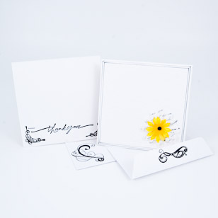 | 3D daisy with black polka dots and yellow center on front. "Thank You " on the inside. Card and envelope embelished with scrolly black designs. |